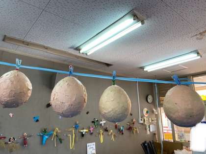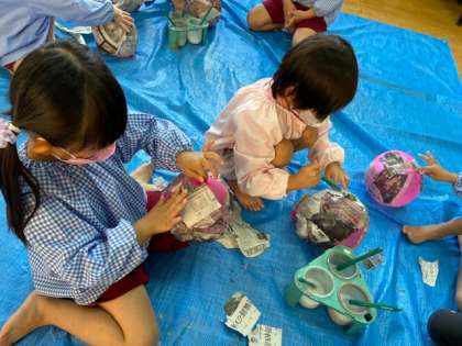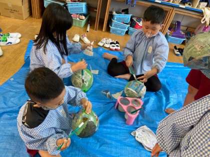 あお組は張り子を作っています。風船をふくらませ、新聞紙を貼って乾かし、その後、上から画用紙を貼りました。「ここ隙間あるわ」「まだまだ紙いるな」と、隙間なく紙を貼れるように、とても真剣に取り組んでいました。全部貼り終えると、とても満足そうな顔をしていた子どもたち。つくった張り子は、皆んなの顔になります。どんな顔にしようか楽しみにしていました。