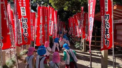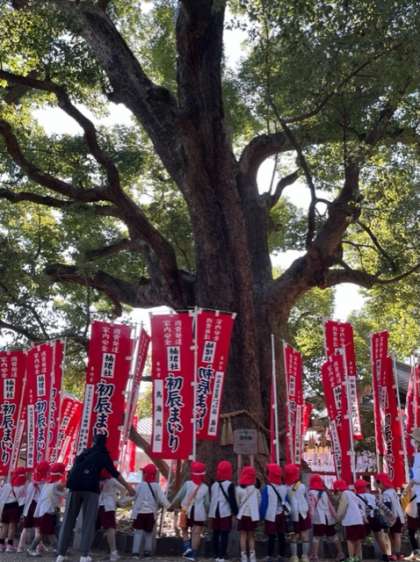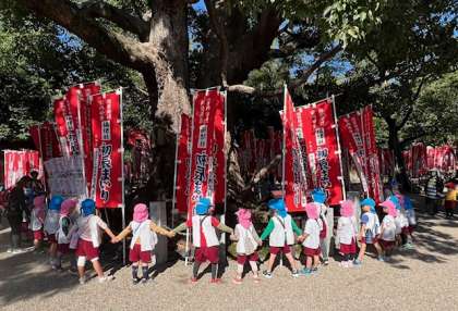 住吉大社に園外散歩に行きました。あお組だけでは囲めなかった大きな木も幼稚園の子どもたちみんなで囲むとゆったりと囲めました。「やっぱりすごく大きいね」と見上げていました。
