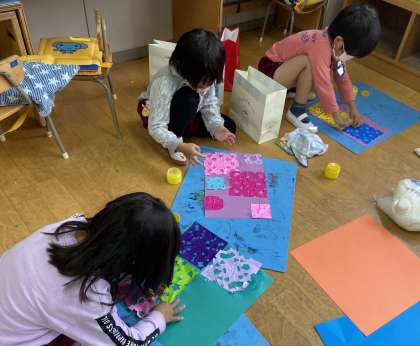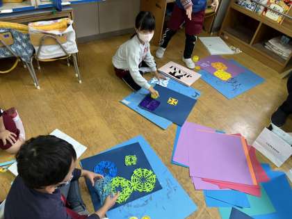 あお組では切り紙をしました。折り紙を好きな形に切り抜き、「どんな模様になっているかな」と開くと、いろいろな模様や形ができていました。広げるまで分からない面白さを感じたり「星みたいになってる」と、思いがけずできた模様や形を楽しんだりしていました。