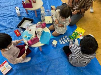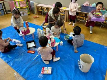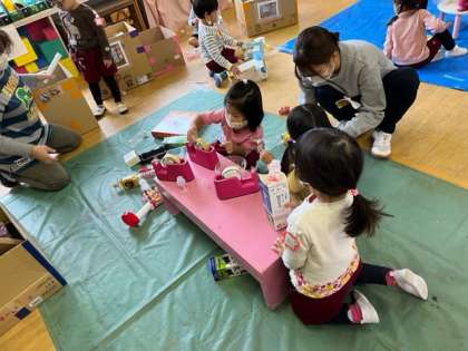 お家から持ってきたいろいろなものを使って、思い思いのものを作って、作ったものを使って遊んでいます。どんなものが出来上がるか、楽しみにしておいてくださいね。