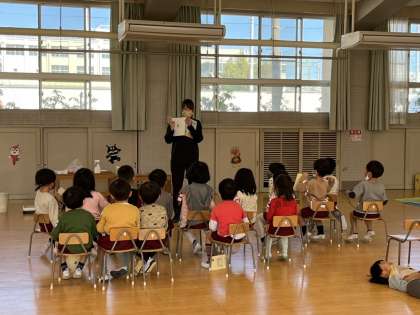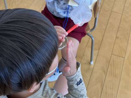 11 月の保健指導は、鼻のかみ方について知らせ、鼻かみ風船で1人ずつ正しい鼻かみの練習をしました。みんな上手にふくらませることができており、「見て!ふくらんだよ!」と教えてくれました。