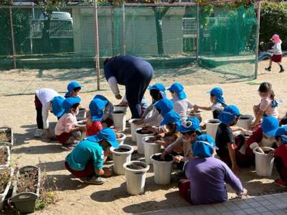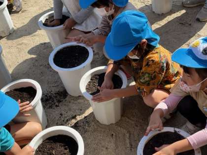 自分の植木鉢に球根を植えました。芽が出るところと根っこが出るところはどっちかな?と球根を確かめて、「小学校に行く頃には花が咲くかな?」と楽しみにして、水をあげていました。