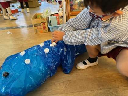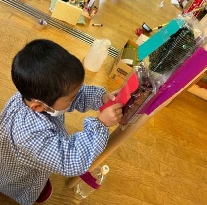遊びの様子 公開日 2022/11/10 更新日 2022/11/10 園の様子 信号をつくったり、ジンベイザメをつくったりしています。自分のつくりたいものをつくるには、「どうすればできるかな」「こんなのないかな?」と、素材置き場に探しに行ったり、いろいろなものも中から「これいいかも」と、自分の作品に合わせてみたりして、一生懸命に思いを表そうとしていました。 いいね(0)