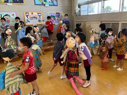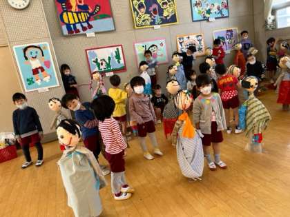自分の作った人形と一緒に並んで、音楽会の歌を歌いました。「お部屋に帰る前に、人形たちに、「待ってってね」と話しかけていました。