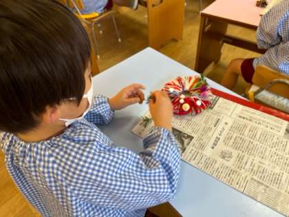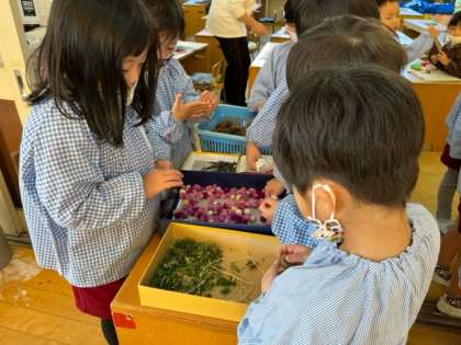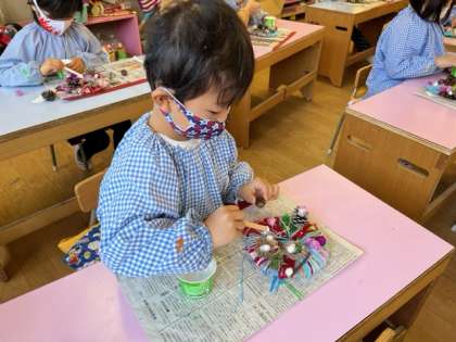 いろいろな自然物をボンドで貼って、飾りをつくりました。大きいドングリや小さいドングリ、幼稚園で咲いた千日紅の花などを見て、「何をつけようかな」と子どもたちの目は輝きました。並べてみて、「きれい」と喜び、笑顔で飾りをつくっていました。