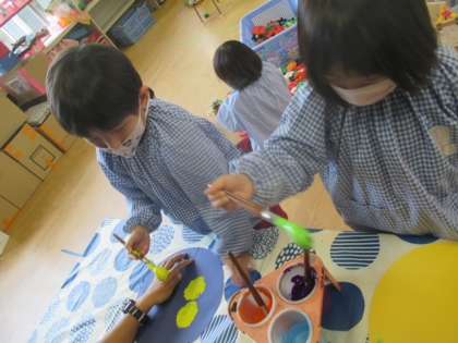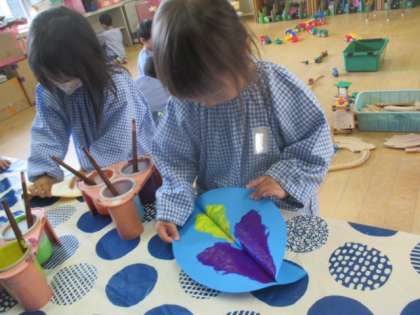 デカルコマニーをしました。絵の具をつけた画用紙を半分に折ってこすると、同じ絵がもう一つできました。「魔法の手でこすったから、2つに増えた」「かわいいなぁ」と大喜びでした。