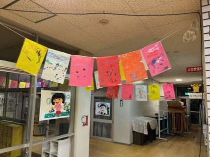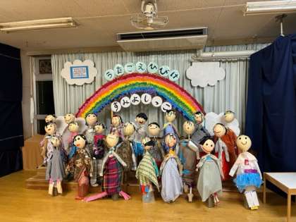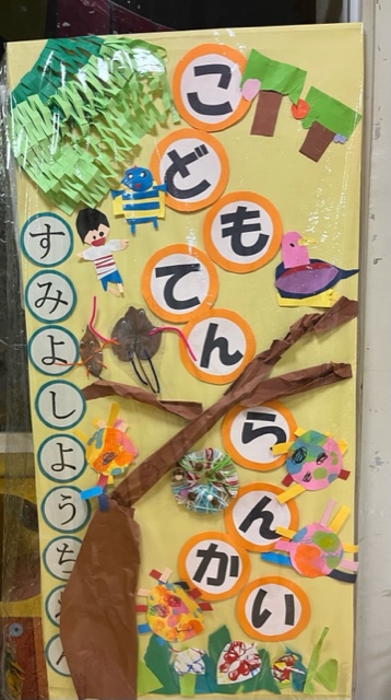 幼稚園に子どもたちの作品があふれたこども展覧会でした。おうちの人に一生懸命につくったものを前にして話をして?いた1日でした。張り子でつくったあお組の子どもたちを、先日の園内音楽会の映像と一緒に見て、歌声を聞いてもらったり、一本一本、毛糸を貼った髪の毛や、いろいろな素材を使ってつくった顔の表情を、じっくり見ていただきました。