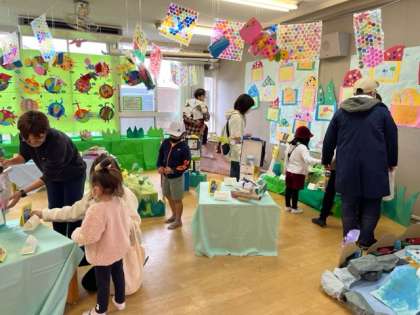 初めての展覧会、いろいろな素材を組み合わせて動物になりました。おうちの人にどんなふうにつくったのかを一生懸命に話して、おうちの人も嬉しそうにこどもたちの話に耳を傾けておられました。コロコロ転がるドングリで遊んだドングリさんも並びました。