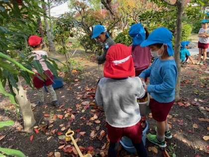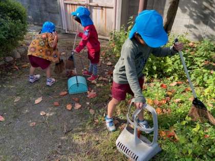 収穫祭に向けて、落ち葉を拾ったり、土を掘って焼く場所をつくったりしました。あお組の子どもたちが、ほうきを持って葉っぱを集めたり、スコップを持って土を掘ったりしている姿を見て、あか組やもも組の子どもたちも一緒に頑張っていました。収穫祭が楽しみですね。