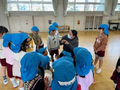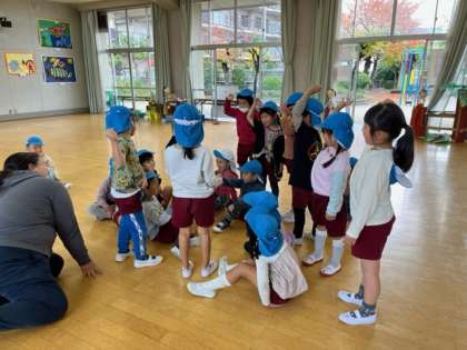 あお組の子どもたちはリズム室で、いろいろなおにごっこをして遊びました。増えおにや氷おに、バナナおにごっこなど、遊び方を知っている友達が知らせてくれて、みんなでルールを確認しながら、遊びました。おに役を決めるじゃんけんで、大人数になってしまい、中々勝負がつかない時には「3人ずつに分かれてジャンケンしたらいいんじゃない?」と、考えたことをみんなに提案したり、「おにの人はタッチって、言葉でも言った方が分かりやすいと思う」など、気付いたことを伝えたりと、子どもたちで遊びを進める姿がありました。夢中で走り回りながら、タッチされたらわかるように、ペロンって言おう」など、ルールを自分たちで工夫して、共有しながら遊んでいました。