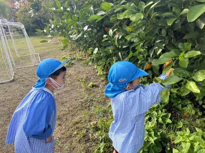 先日、園庭のみかんが色づいてきたことに気付き、みんなで収穫をしました。「どれがいいかな?」「美味しそうな色になってるな」と、話をしながら、ハサミを使い軸を上手に切って収穫をしていました。