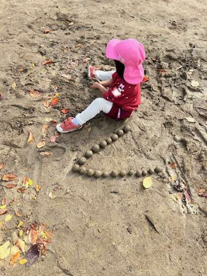 焼き芋の後の園庭の土が?お団子作りにちょうど良かったようで、もくもくとつくっていました。「1人で作ってん」「服が汚れたら洗濯したらいいだけやから」と座り込んで、長い時間つくっていました。並べ方も考えていました。最後は宝箱に入れて、入りきらないものは友達の宝箱も借りて、入れていました。