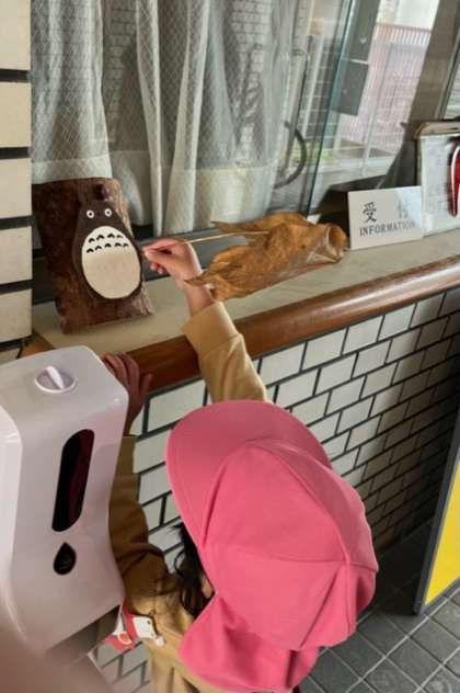 園庭で大きな葉っぱを見つけ、持って歩いていました。玄関のトトロのところに行き、映画に出てくる大きな葉っぱを思い出したのか、トトロに見せていました。