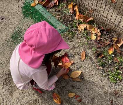 園庭の桜の赤い葉っぱを集めて、枝にさして遊んでいました。