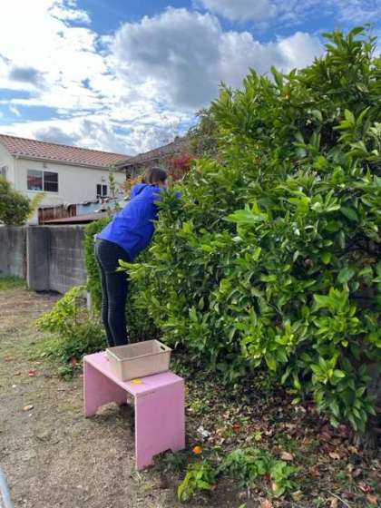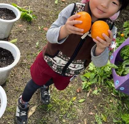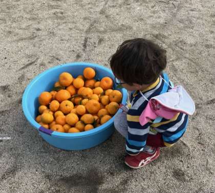 園庭に黄色になっていたミカンを子どもたちも気になっていて、収穫しました。高いところにあるので、子どもは届かず、先生が採ったものを運ぶミカンやさんをしてくれました。大きいミカンを渡すと「重い」とビックリしたり、2つつながったミカンを渡すと「サクランボみたい」と喜んだりしていました。「いっぱいになってきたな」と喜んだりし、「いいにおいや、食べたいな」と、大きいミカンを手に持っていたりしました。