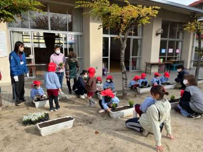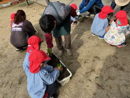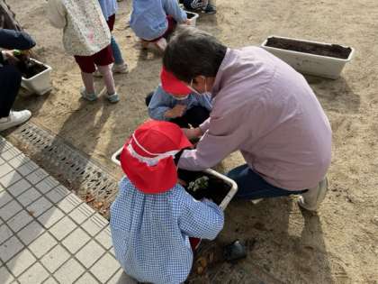あか組もプランターに一緒に苗植えをしました。花の名前をナデシコ、アリッサムと教えていただき、」どんな色の花が咲くのかな」と、楽しみにしながら、ポットから苗を取り出したり、土をかけたりすることを教えていただき、植えました。