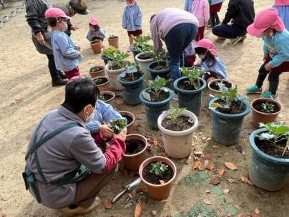 もも組は、チューリップを植えた鉢にいただいたビオラを植えました。「このお花はビオラって言うんだよ」「優しくお花持ってね」と、教えてもらいながら、植えました。水やりも優しくしていました。