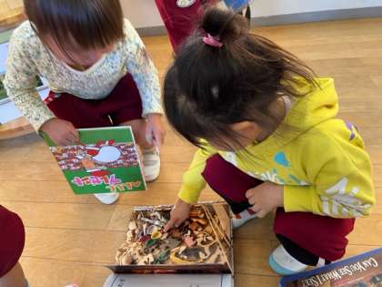絵本、一緒に見よう! 公開日 2022/12/06 更新日 2022/12/06 園の様子 もも組に行くと、「読んで」と絵本を持ってきました。写真から小さなシーモアを探す絵本やクレヨンが出てくる絵本などを楽しみました。 いいね(0)
