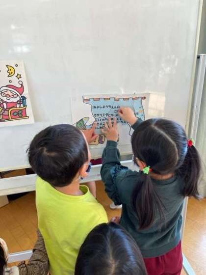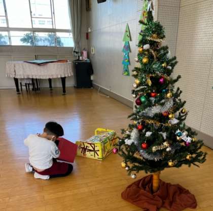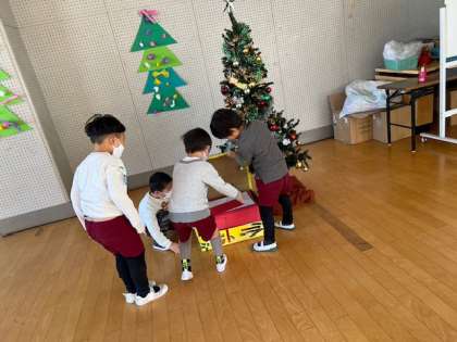 朝、あお組の子どもたちが、リズム室に行くと、ツリーの元に宝箱が。「こんなところにこんな宝箱なかったのに」中を開けると大変!手紙とポストが入っていました。「サンタさんからかもしれない!」慌てて、みんなに知らせに行きました。先生に読んでもらうと、やっぱりサンタさんからの手紙でした。どうやら幼稚園のいろいろなところにパズルが隠されているとのことで、みんなで探し回りました。「このパズルは、友達と仲良く探さないと消えてしまうらしい」と、みんな歩いて、見つかったパズルを組み合わせていました。