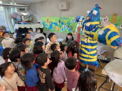 ?最後の一つがなかなか見つからず、みんなで探していたら、あお組がつくったかかしのサンダーキングドラゴンが持っていました。