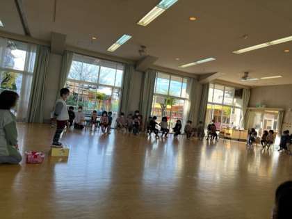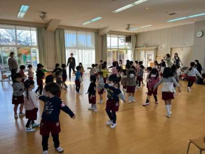 11月生まれと12月生まれの子どもの誕生会をしました。走ったりウサギになったりして入場しました。お家の人と一緒に『やきいもグーチーパー』で遊んだり、みんなで『おでんぐつぐつ体操』をしたりして、楽しい時間を過ごしました。