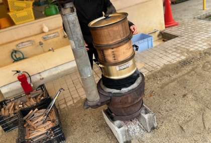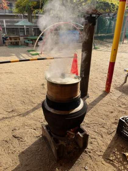 お米を蒸す匂いに笑顔で登園してきた子どもたち。「いい匂い」「蒸気機関車みたいなゆげ出てる」と、いつもと違う雰囲気に子どもたちはワクワクしていました。