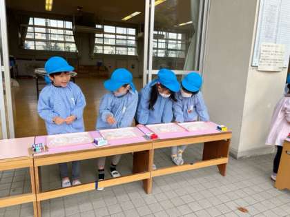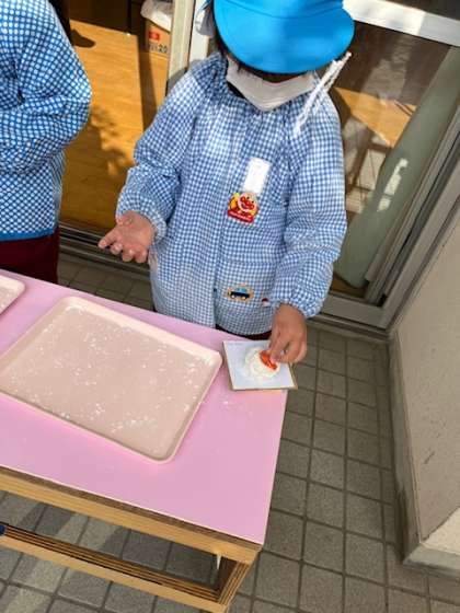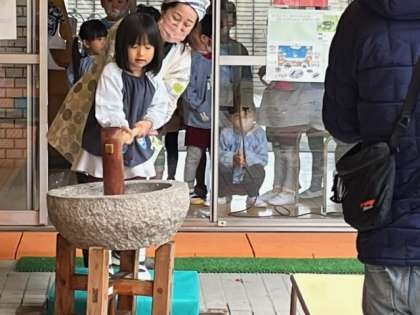 子どもたちも一人ずつ杵でつきました。重たい杵をしっかり持って、上手につくことができていました。つきあがったお餅は、自分だけの鏡もちにしました。「温かいね」「気持ちいいな」と、つきたてのお餅の感触を楽しんでいました。