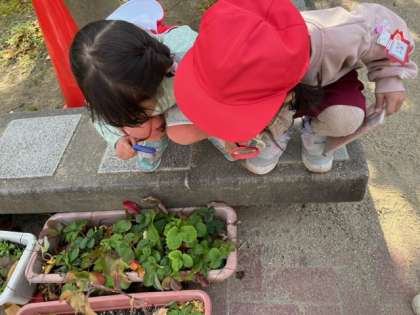 あか組の様子を見ていてもも組がフープに取り組んだり、虫眼鏡を持って、園庭を探検し、いろいろなものを見つけては、「イチゴの葉っぱはどんなふうになっているのかな?」と覗き込んだりしていました。