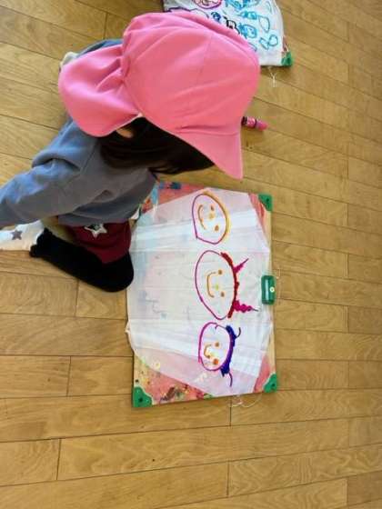お休みしていてたこに絵がまだかけていなかった子どもたちは、月曜日の凧揚げを楽しみにして凧の絵を友達とおしゃべりしながらかいていました。「私とママがたこに乗って飛ぶよ」と話していました。