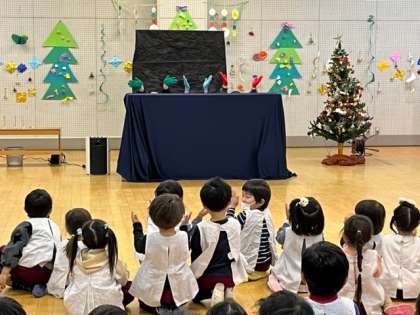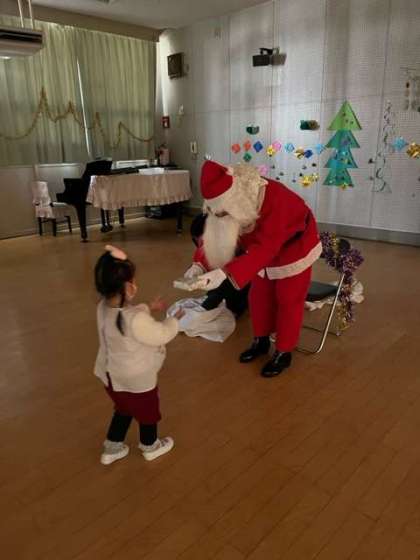 お楽しみ会がありました。金曜日にあお組が飾り付けをしたリズム室に集まり、ツリーを見たり、ロウソクに火を見ていると、鈴の音が聞こえてきて、サンタクロースが来てくれました。「サンタさんだ!」「ほんとに来てくれた!」と、大喜びの子どもたち。質問をしたり、プレゼントをもらったりして、お礼に『あわてんぼうのサンタクロース』の歌をたいました。楽しい時間を一緒に過ごすことができ、「今日は来てくれてありがとう」「また来てね」と言っていました。お楽しみ会の後、園庭には、たくさんの氷とソリの跡があり、「サンタさんソリに乗って来てたんやな」「寒いところに帰00ったんかな」と、ソリの跡を見たり、氷を触ったりしていました。「またね」と、大きな声で空に向かって、大きく手を振っていました。