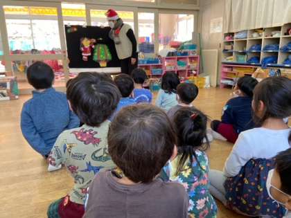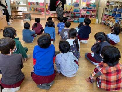 絵本の会 1 公開日 2022/12/20 更新日 2022/12/20 園の様子 絵本の会の方が来てくれました。季節の絵本をいろいろと読んでもらいました。じっと絵本を見ながらお話に集中していて、「このあとどうなると思う?」と聞かれると、「僕やったらジャンプするわ」「一緒に遊ぶと思うー」など、口々に想像して答えていました。最後にはサンタクロースのパネルシアターを見せてもらい、歌に合わせて身体を揺らしていました。「ありがとうごさいました、良いお年を」と、最後は挨拶をしました。 いいね(0)