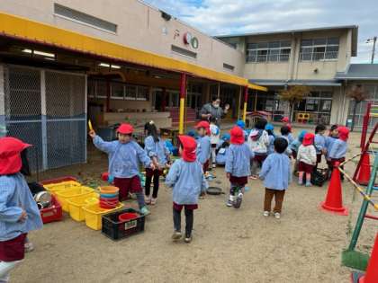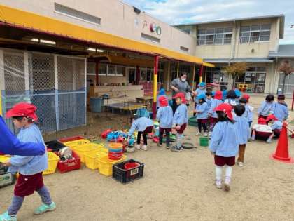 2学期が終わるので、園庭で遊んだ後に砂場の遊具の片付けを、あか組とあお組の子どもたちでしました。あお組が、温かいお湯を入れたタライの中で、遊具を一つずつ丁寧に洗い、それを受け取ったあか組が種類ごとにカゴに分けて片付けました。みんなで力を合わせて、2学期の汚れを落として、とてもキレイになりました。3学期も気持ちよく使えますね。
