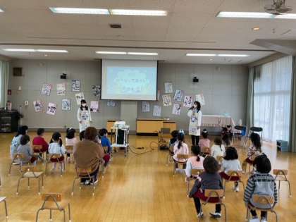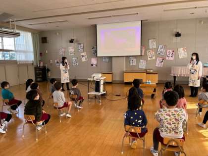 手洗い教室を花王の講師の方に来ていただいて、行いました。手には見えないバイキンがいることやいつ手洗いをするのかを、映像を使って教えていただきました。いつも幼稚園でしているあわあわ手洗いの歌を流しながら、手の洗い方をもう一度みんなで練習してみました。