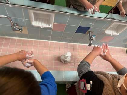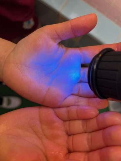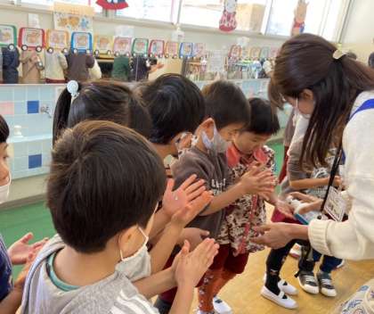 手洗いチェッカーのクリームを透明な絵の具と言って知らせ、手につけて、歌に合わせて手洗いをし、取れたかどうかを確認しました。しっかり洗ったと言う子どもたちでしたが、手洗い後にブラックライトで確認すると、手に残っていたクリームが光り、「あれ、洗ったのに」とビックリして、また洗いに行っていました。上手に洗えていたり、何度も洗いに行ったりして、手洗い名人になれるようにと、子どもたちは一所懸命に、手洗いを頑張っていました。「みんなも名人だね」と言われると誇らしげにしていました。