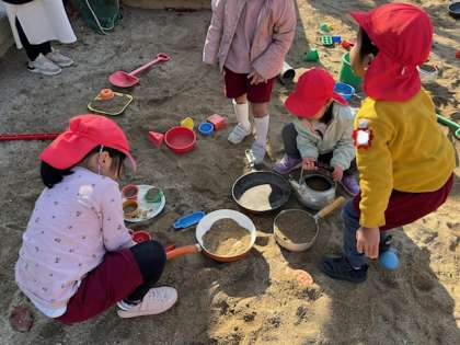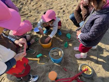 2日に分けて、保育参観を行いました。朝から園庭で遊びを楽しむ子どもたちがたくさんいました。年末にみんなで片付けた砂場の遊具を使って、友達とごっこ遊びを楽しんでいました。