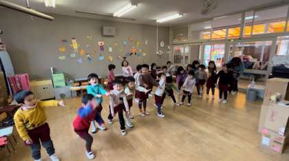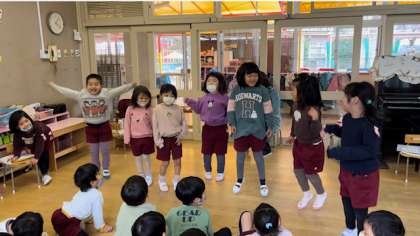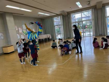 絵本のお話からイメージを広げながら、体を使って表現したり、みんなで登場するものをつくって表現したりして遊んでいます。どんなふうに表現しようかと友達と一緒に考えたり、友達の様子を見たり、真似をしてみたりしながら楽しんでいます。