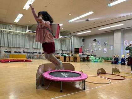 劇の中の表現方法を子どもたちと一緒に考えてつくりあげている途中です。意見がたくさん出てきて、思いを伝え合いながら、どの表現がよく分かるかを相談して、決めていきました。同じ場面でも、違う言葉が出ることがあります。でも、話の筋が分かっているので、ストーリーが通じています。自分が出ない場面でも、友達の様子をじっくり見ているあお組の子どもたちです。