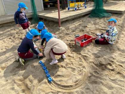 砂場でたくさんの汽車をつなげて、線路を作ることを楽しんでいました。