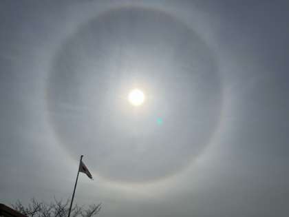 園庭で遊んでいると、「空に不思議なものがある」「空に虹がでてる」と、子どもたちが教えてくれました。空を見上げると、太陽の周りに丸い虹がでていました。