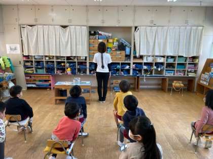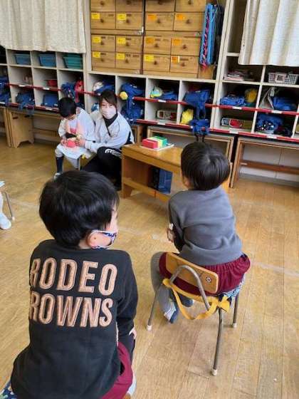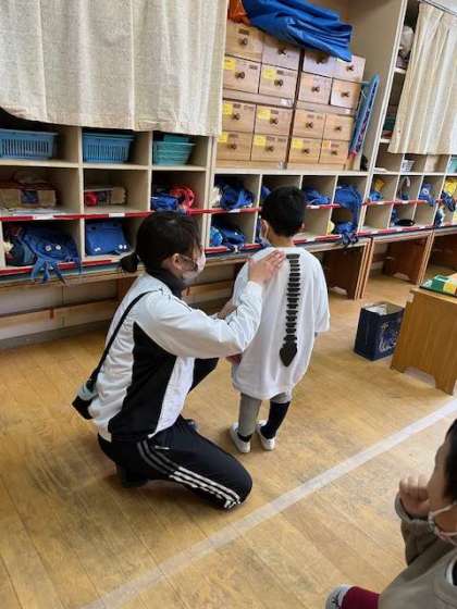 あか組、あお組に、よい姿勢について保健指導を行いました。よい姿勢でいると、骨も真っ直ぐになり、身長が伸びて大きくなれること、よい姿勢でご飯を食べるとお腹が圧迫されず消化が良くなることを伝えました。その後のお弁当の時間には、「せなかピン、できてるよ」「僕の姿勢どう?」とよい姿勢を意識できていました。