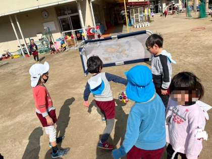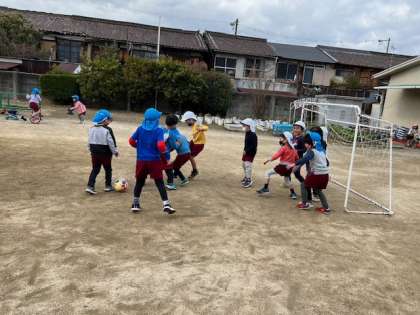 新しいボールとゴールでサッカー遊びをしていました。チームを決めて、足だけでボールを触るというルールを何度も確認しながら、楽しんでいました。
