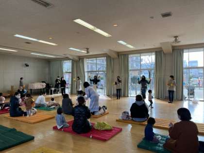 その後、『アヒルのダンス』や『エビカニクス』を踊って遊びました。最後には、あか組が生活発表会でした歌と楽器遊びを披露しました。