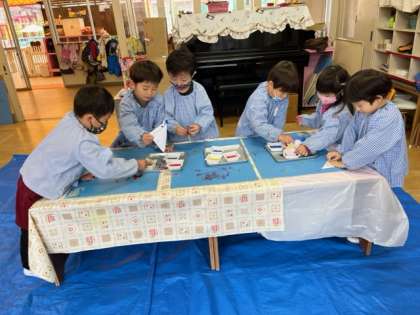 赤、青、黄の色のついた水に、折った紙を浸して、染め紙をして遊びました。そっと開くときれいな模様ができていました。