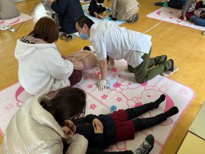 コロナ禍で、幼稚園では歯磨きをしてこなかったあお組。園歯科医の田中先生と歯科衛生士さんに、保護者と一緒に仕上げみがきについて教えていただきました。膝に寝転んだり、向かい合ったりしながら仕上げみがきをしてもらいました。