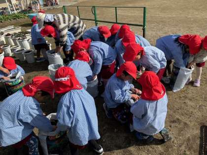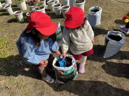 ジャガイモの種イモを、袋に入った土に植えました。種イモをじっくり見て、「ここから出てくるの?」「ちょっと伸びてるところがあるよ」と、小さな芽を不思議そうに見ていました。手やスコップで土をしっかり掘り、水やりまで上手にしていました。あお組になって収穫するのが楽しみですね。