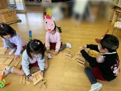 生活発表会の劇遊びで使ったお面をつけて、こぶたやオオカミになって遊んだり、小さなブロックでいろいろなものをつくったり、画用紙でベルトをつくったりして、楽しみながら遊んでいます。小板積み木で遊ぶことも好きになってきました。並べたり、積み上げて遊んだりしています。