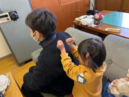 あお組の2つ目のグループが園長室で一緒にお弁当を食べた後、「おうちでもしてる。得意やねん」と、肩たたきをしてくれました。「気持ちいいやろ」と嬉しそうに笑っていました。
