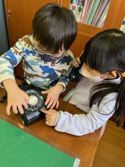 園長室にある黒電話を見て「昨日テレビで見た。ほんとにかけられるの?やってみたい!」とかけてみました。自分で指を入れてダイヤルを回していました。