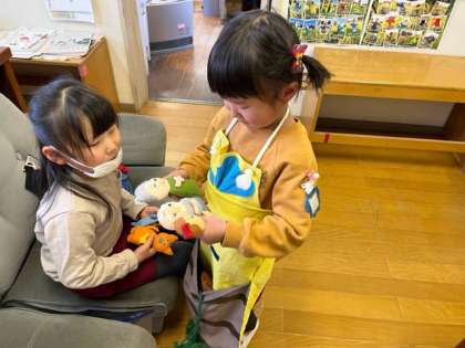 エプロンシアターを見つけて、お話を友達と一緒につくっていました。
