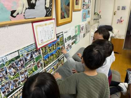 かかしプロジェクトのポスターを見て、自分達のかかしが載っているので喜んでいました。